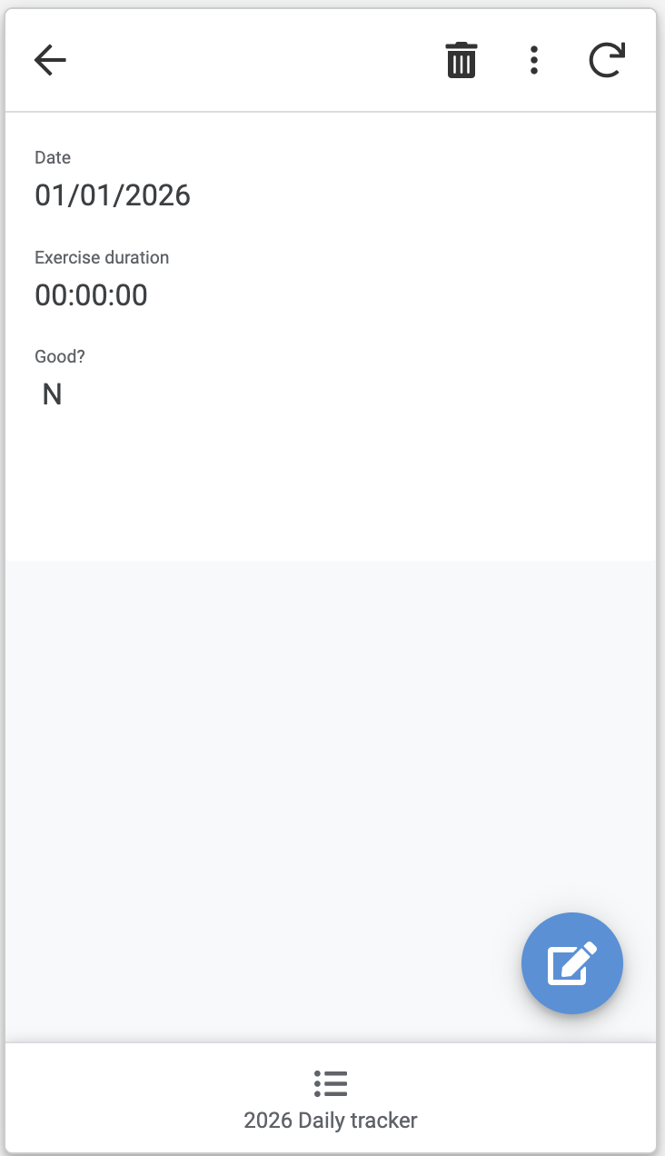 You should now be able to install (on your phone) the app called “AppSheet”, and within it go to “App Gallery” > “Owned by me” > “2026 Daily tracker”, and you’ll be presented with a UI like this (the date format may be different; it shows up in m/d/yyyy format on my phone but dd/mm/yyyy in the screenshot below):