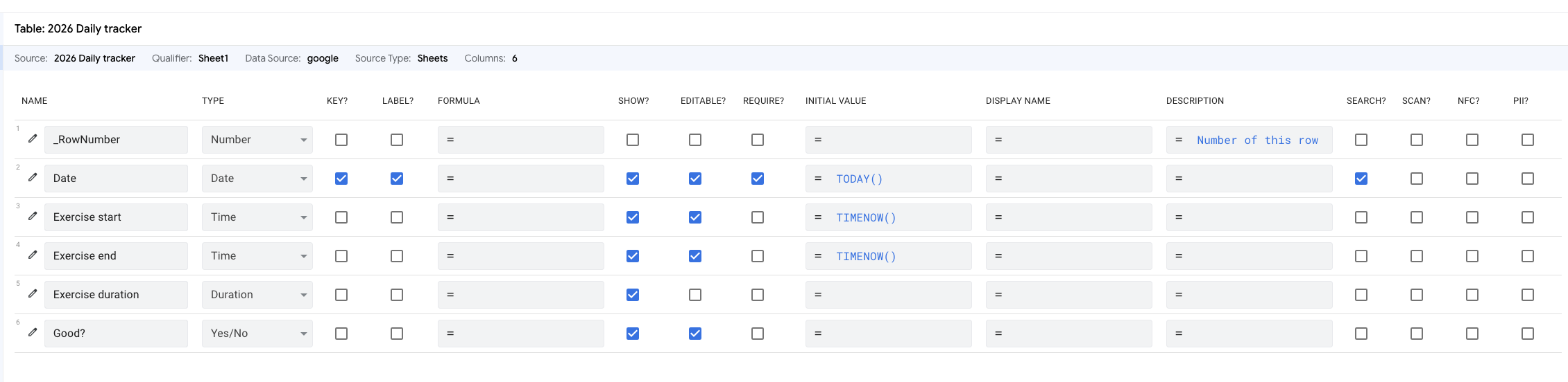 Add the columns you want. For this example, I want to track two things for each date: a duration (for the sake of example, I’ll call it “exercise duration”) and a yes/no value (for this example, I’ll just call it “Good?”). Although I care only about the duration and not the start/end time, it turns out that the app makes it easy to enter the “current” time, so I’ll go ahead and track those as well.